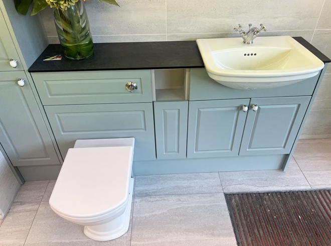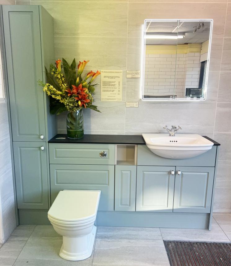 We have been updating our showroom & are now displaying the Utopia Amelia range of fitted bathroom furniture in English Duck Egg with English Parchment carcasses & a thin compact laminate worktop in Graphite Slate. To continue the more traditional look we have used the Vitra Valarte range of sanitaryware & a Booth & Co. Axbridge basin mixer. To complete the display, we used an HIB Isoe steam-free, LED illuminated double door cabinet with integrated 2-pin & USB charging sockets, toothbrush charger & all finished off with our Lulworth range of wall & floor tiles.