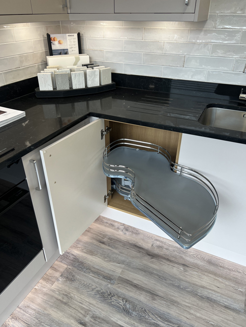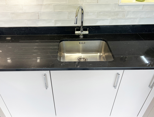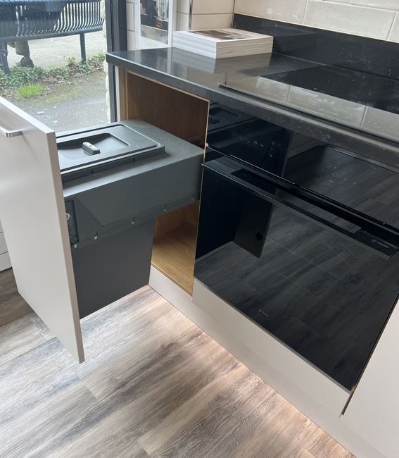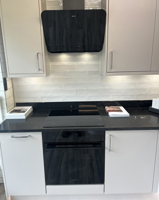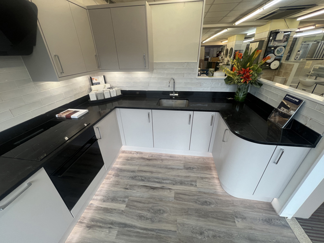 We have been updating our showroom & are now displaying the Jigsaw Vivo+ Slab door kitchen range in a Matt Cashmere finish with Oak carcasses. We have included a Sense built-under oven, induction hob & Omnis cooker hood from Caple, an undermounted sink from Franke with their Athena tap, a stunning Cloudy Black Corestone worktop with matching upstands & to finish everything off we are displaying our Asha range of wall tiles, Karndean Palio flooring in Sicilia & under cabinet lights & plinth lighting from Sycamore LED.