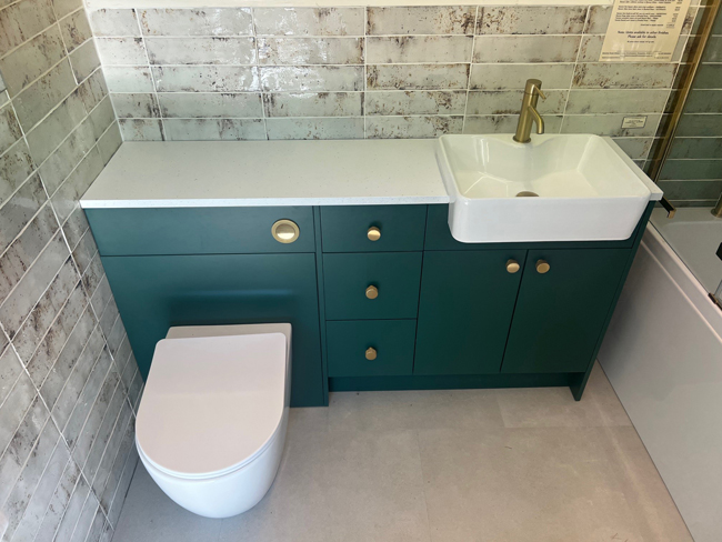 Ex-Display 1.Novum Genesis bathroom furniture display with Slab doors in Dark Emerald comprising a washbasin unit, 3-drawer unit, WC unit, Square edged worktop in Elysium White, Neo Square washbasin, Atlas basin mixer tap in Brushed Brass, Aero WC pan, soft close seat & concealed cistern. Total overall length is 1500mm. This display normally retails at £ 3,205.00. Our ex-display price is £ 1,250.00.
